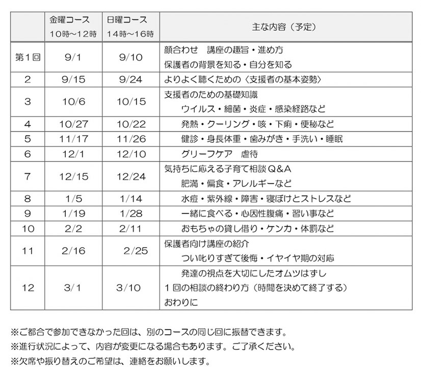 9月1日より日より全12回 原則第1・3金曜 10:00~12:00